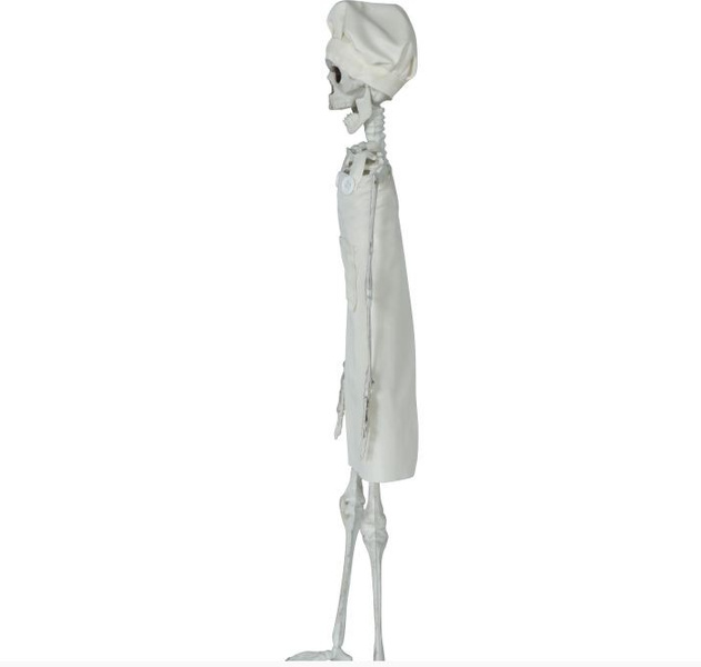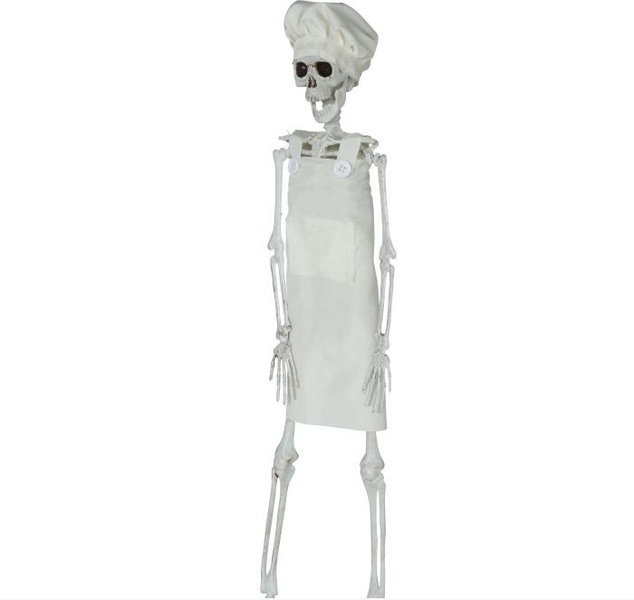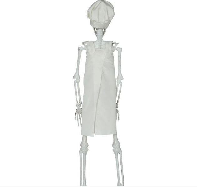 Szkielet ubrany w biały fartuszek i czapkę.