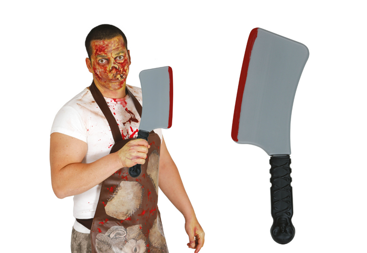 posiada czarną rączkę, ostrze szare oraz plamy krwi.