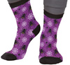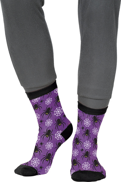 Fioletowe skarpetki z nadrukiem czarnych pająków.