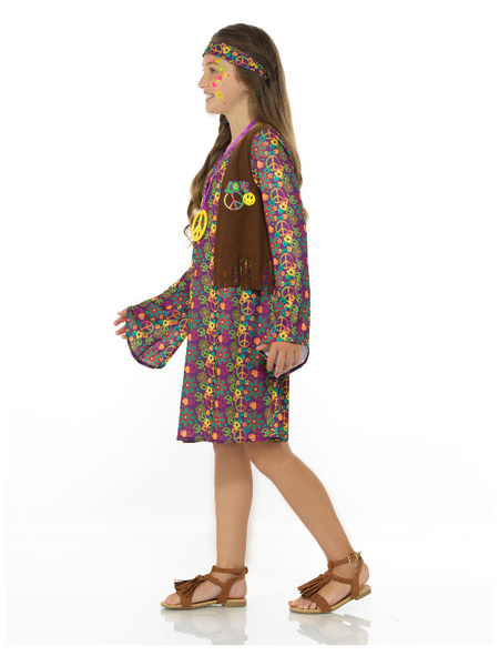 Do sukienki doczepiona jest brązowa kamizelka z frędzelkami.