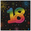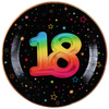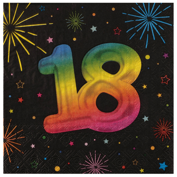 Zastawa jednorazowa z kolekcji Fiesta na osiemnaste urodziny. Kolor czarny z kolorową cyfrą i nadrukiem gwiazdek i kropek.