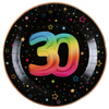 Zastawa jednorazowa z kolekcji Fiesta na 30 urodziny. Kolor czarny z kolorową cyfrą i nadrukiem gwiazdek i kropek.