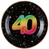 Zastawa jednorazowa z kolekcji Fiesta na 40 urodziny. Kolor czarny z kolorową cyfrą i nadrukiem gwiazdek i kropek.