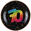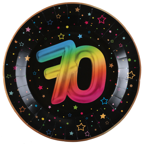 Zastawa jednorazowa z kolekcji Fiesta na 70 urodziny. Kolor czarny z kolorową cyfrą i nadrukiem gwiazdek i kropek.