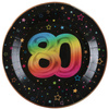 Zastawa jednorazowa z kolekcji Fiesta na 80 urodziny. Kolor czarny z kolorową cyfrą i nadrukiem gwiazdek i kropek.