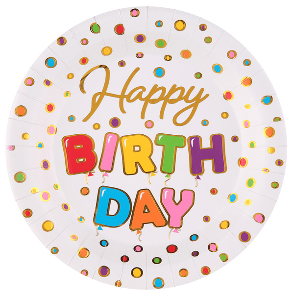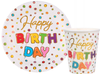 Zastawa jednorazowa z napisem Happy Birthday w kolorowe kropki.