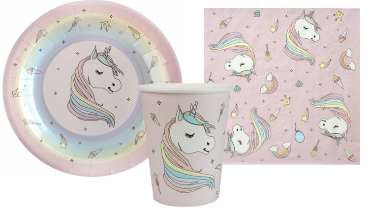 Zastawa jednorazowa z motywem jednorożca w pastelowych odcieniach.