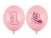 Balony różowe z nadrukowanymi jedynkami i butkami.