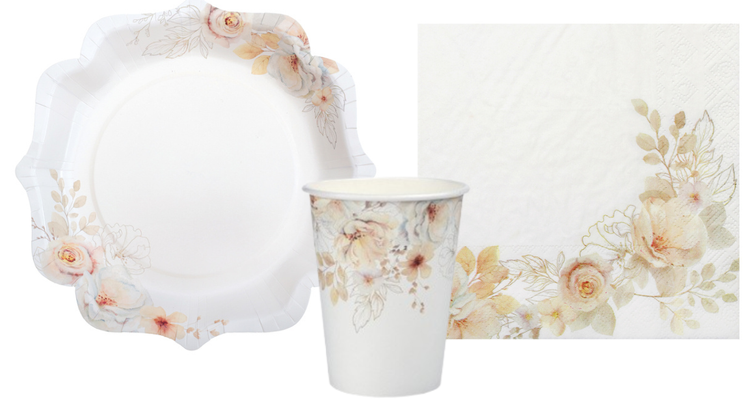 Zastawa jednorazowa z kolekcji kwiaty Softness, delikatny nadruk kwiatów w pastelowych kolorach.