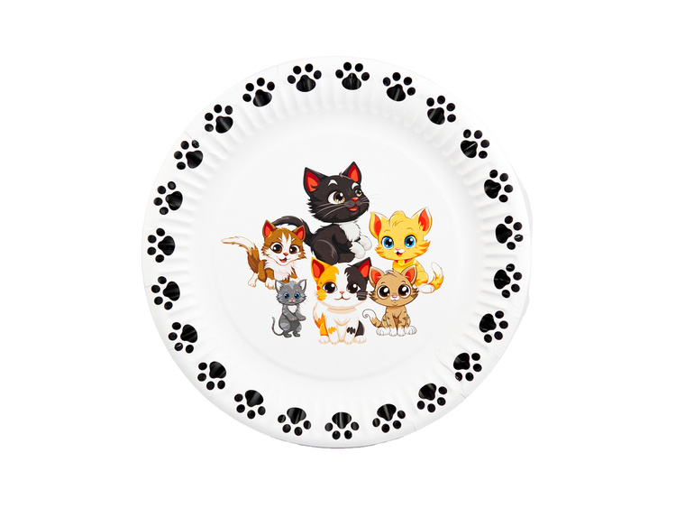 Talerzyki papierowe z motywem kocich przyjaciół.
