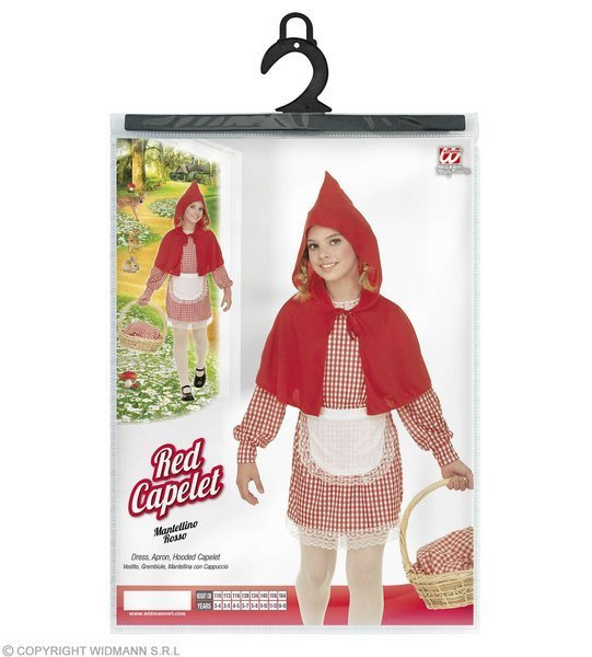 Czerwona peleryna z kapturem zawiązywana na kokardę.