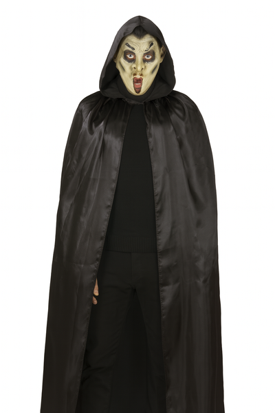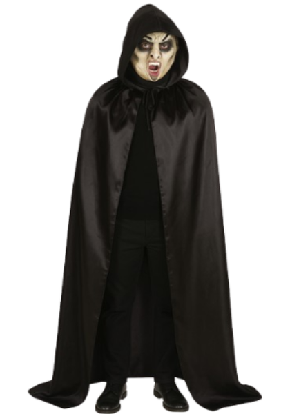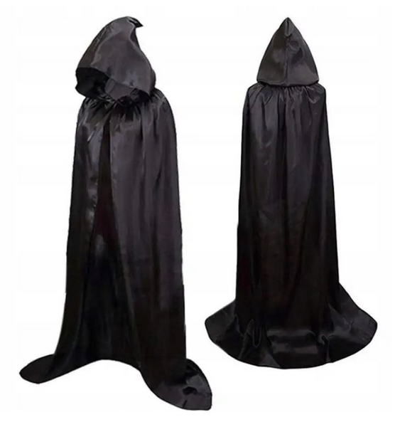 -pelerynę czarną z kapturem, z materiału imitującego satynę, długość ok. 140cm