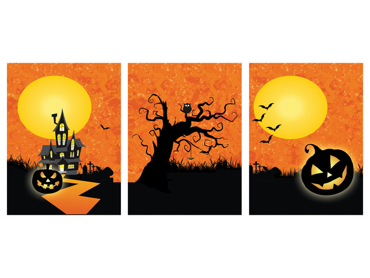 - Motyw strasznego domu z dyniami, nietoperzami i sową idealnie wpisuje się w halloweenowy klimat, dodając dekoracji mrocznego uroku.