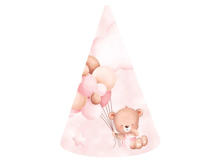 Czapeczki Papierowe Różowe z Balonikami i Misiami.