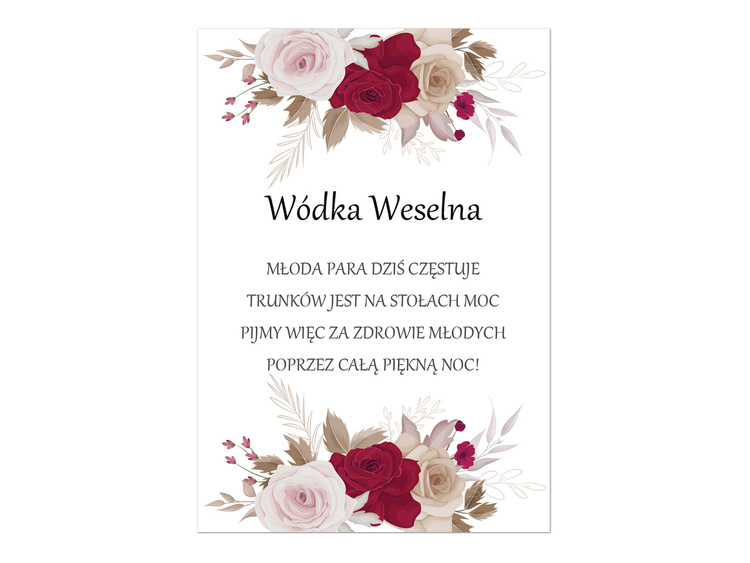 - Nadrukowany wierszyk: „Wódka weselna Młoda para dziś częstuje trunków jest na stołach moc pijmy więc za zdrowie młodych poprz całą noc piękną noc!”