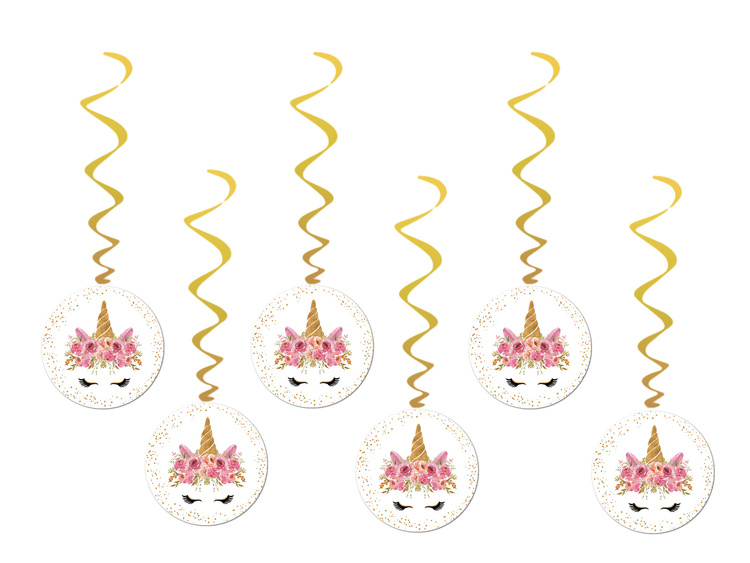 - Dekoracja wisząca w formie świderków z nadrukiem głowy jednorożca w kwiecistym wianku.