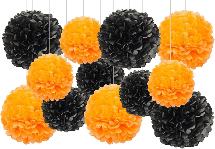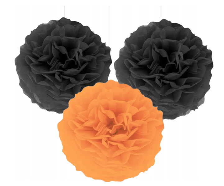 Zestaw dwóch pomponów bibułowych w kolorze czarnym i pomarańczowym. Idealne jako dekoracja na imprezę z okazji Halloween. Rozmiar pomponów 25cm. Pompony do samodzielnego złożenia – w komplecie instrukcja ułatwiająca przygotowanie ozdób.