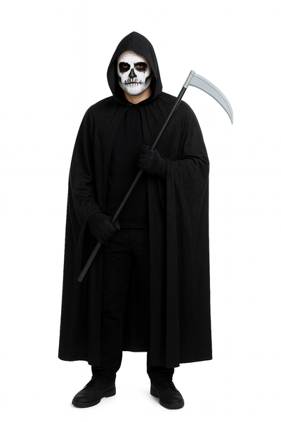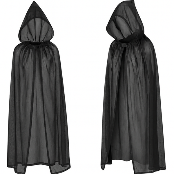 -pelerynę z kapturem w kolorze czarnym, długość 135cm, zapinana przy szyi. Skład: 100% poliester