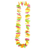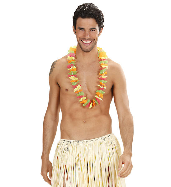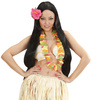 Naszyjnik hawajski wykonany z materiałowych kwiatów nawleczonych na gumkę.