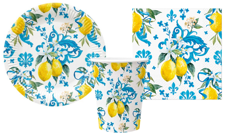 Zastawa jednorazowa z motywem cytryn i niebieską mozaiką.