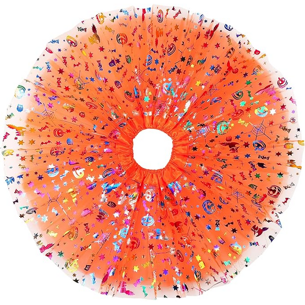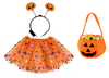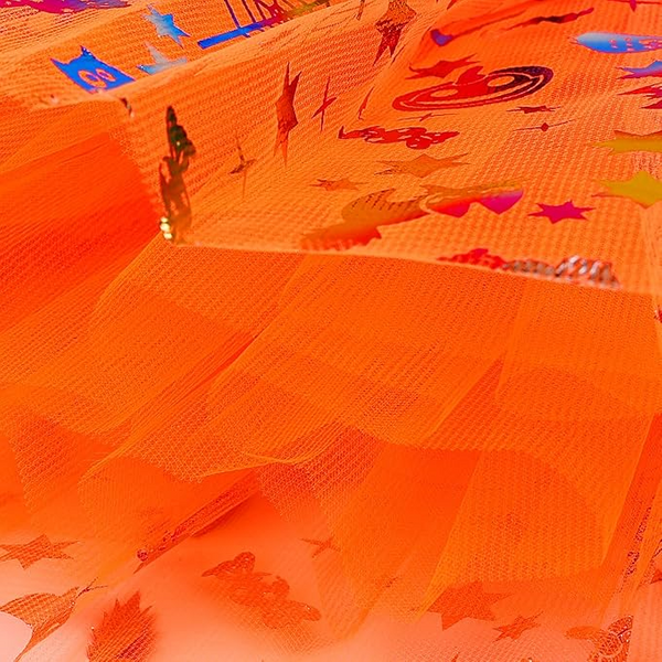 - Spódniczka: pomarańczowa, z halloweenowym nadrukiem (dynie, nietoperze, czarownice), wykonana z trzech warstw tiulu dla puszystego efektu, z elastyczną gumką w pasie dopasowującą się do obwodu 40–70 cm (długość 30 cm).