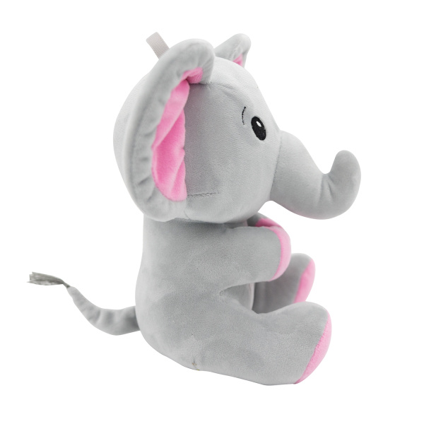 - Pluszowy ciężarek w kształcie słonika o szarym futerku i różowych uszach oraz łapkach.