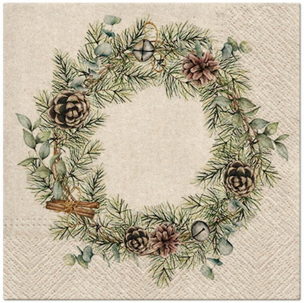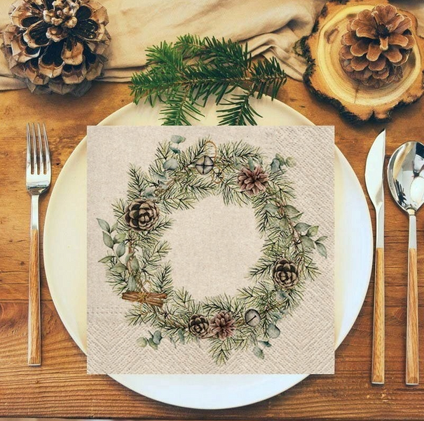 - Nadruk: naturalna kolorystyka beżowa z nadrukiem wianuszka z gałązek i szyszek.
