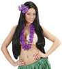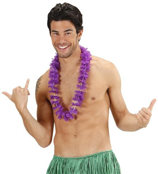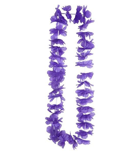 Naszyjnik hawajski wykonany z materiałowych kwiatów nawleczonych na gumkę.