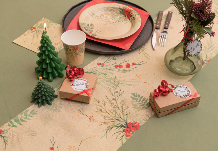 - Kolorystyka: kraftowe tło z akwarelowym nadrukiem jarzębiny i świerkowych gałązek.