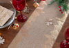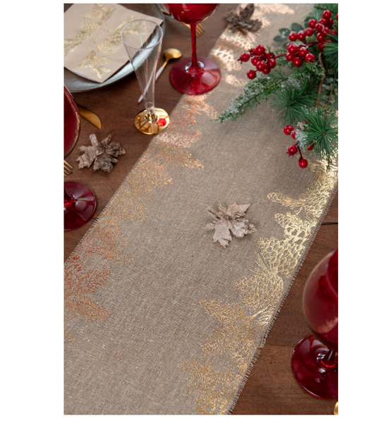 Elegancki, beżowy bieżnik na stół z motywem Złotych szyszek. Bieżnik jest częścią naszej kolekcji ŚWIĄTECZNA KRATA. Mimo że bieżnik nie posiada nadruku kraty.