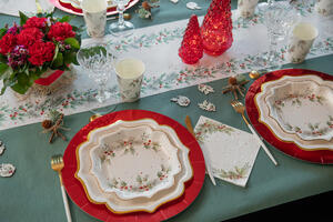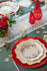 - Wzór: gałązki świerku i jarzębiny z czerwonymi owocami.