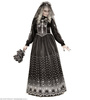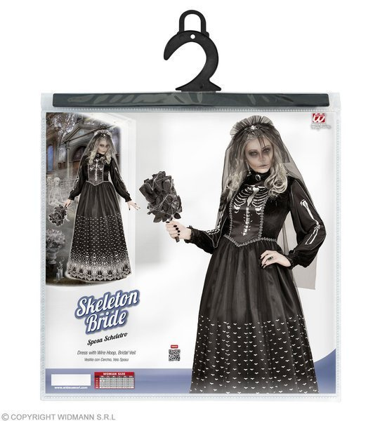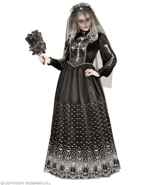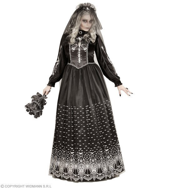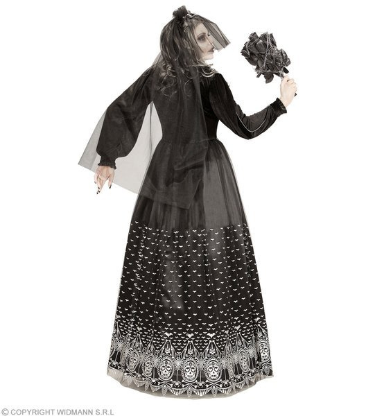Pięknie zdobiona czarna suknia z długim rękawkiem. Dół sukienki na kole, dzięki czemu suknia nabiera objętości. Welon mocowany na opasce z tworzywa sztucznego.