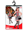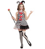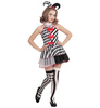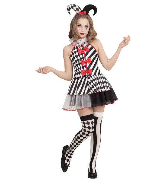 Sukienka ze stójką zapinana z tyłu na rzep. Dół rozkloszowany, dzięki dwóm warstwom tiulu. Całość zachowana w odcieniach czerni i bieli. Jedna część w szachownice, druga w czarno-białe pasy. Przód ozdobiony czerwonymi kokardami. Do opaski przytwierdzono małą czapkę błazna.