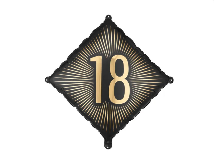 - Balon foliowy w kolorze czarnym z kontrastującym, złotym napisem „18”.