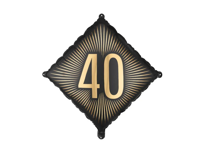 - Balon foliowy w kolorze czarnym z wyrazistym, złotym napisem „40”.