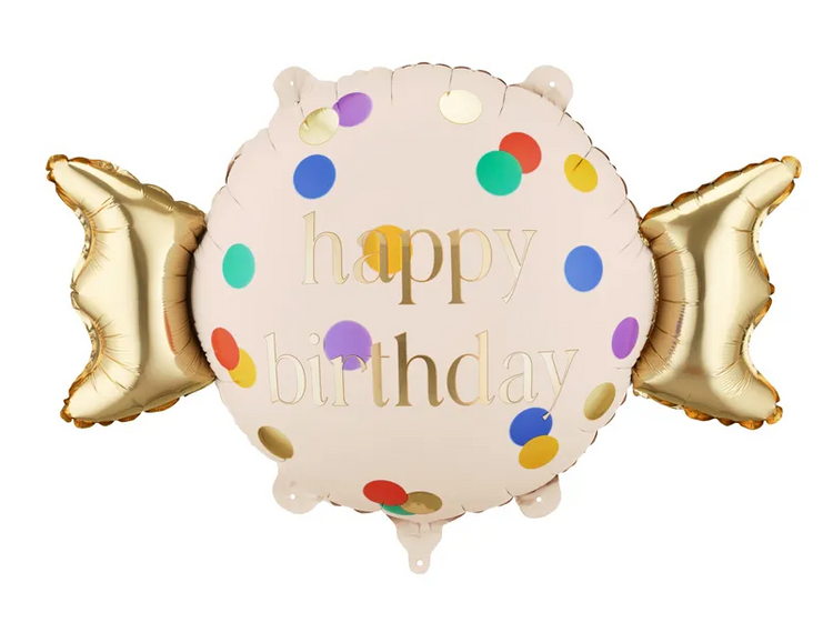 - Balon foliowy w kształcie cukierka z ozdobnym napisem „HAPPY BIRTHDAY”.