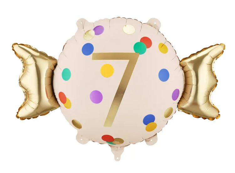 - Balon foliowy w kształcie cukierka z wyraźną cyfrą „7”.