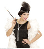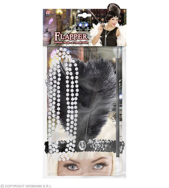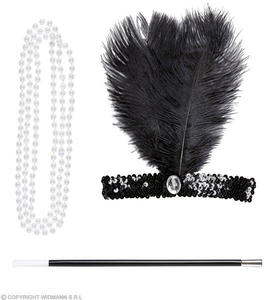 Ozdobiona czarnymi cekinami i okazałymi piórami oraz przeźroczystym kryształkiem.