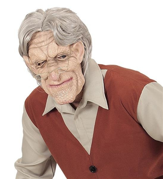 Maska wykonana z lateksu. Przedstawia pomarszczoną twarz dziadka. Twarz z dużym nosem i odstającymi uszami. Do maski doczepione były siwe włosy.