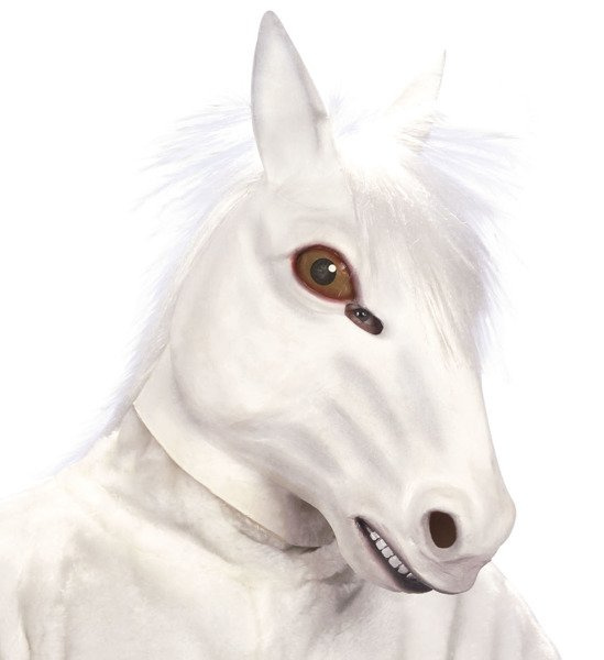 Maska lateksowa koń. Maska w kolorze białym. Zwierzę ma wszyta grzywę. Maska zakrywa tył głowy.