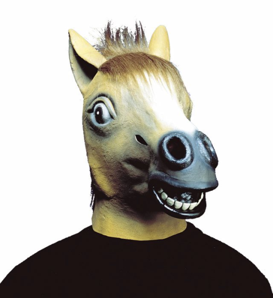 Maska lateksowa koń. Maska w kolorze brązowym. Zwierzę ma wszyta grzywę. Maska zakrywa tył głowy.