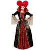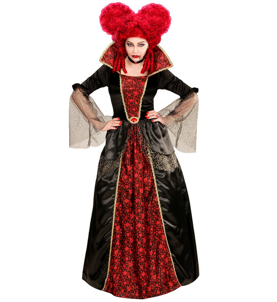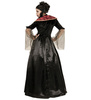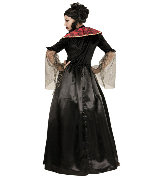 Suknia z pokaźnym kołnierzem. Rękawki długości 3/4, z dołączoną tiulową falbanką. Góra sukienki wykonana z bogato zdobionego materiału. Talia ozdobiona kryształkiem i baskinką. Dół sukni rozkloszowany wykonany z atłasowego materiału w kolorze czarnym z elementami czerwonego.