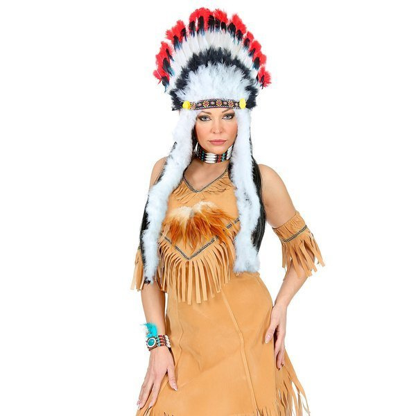 Wykonany z piór, w kolorze czarno-biało-czerwonym.