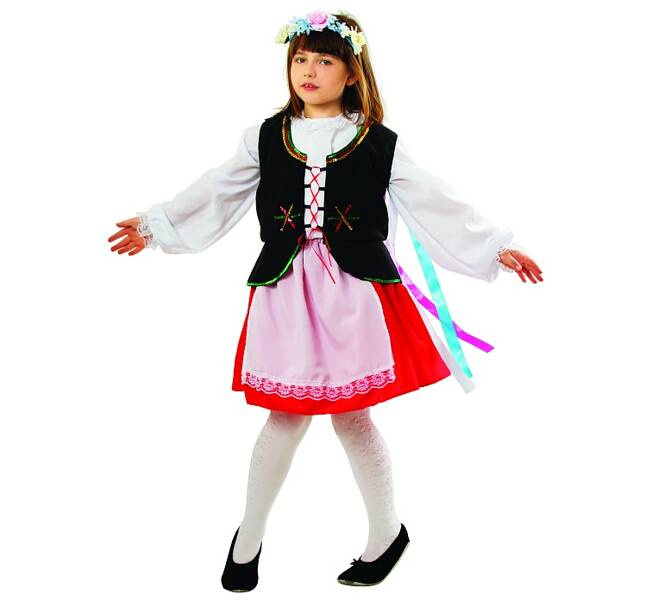 Kamizelka czarna, zakończona kolorowymi tasiemkami i cekinami, wiązana na przodzie.