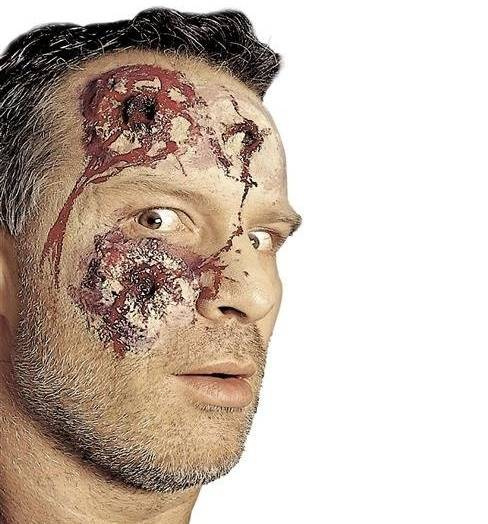 Bardzo realistyczna, sztuczna rana postrzałowa.