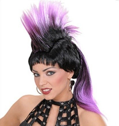 Peruka w kolorze: czarno-fioletowym, włosy od czubka głowy postawione, boki przystrzyżone.