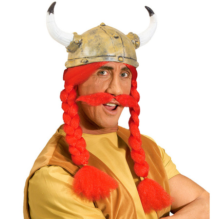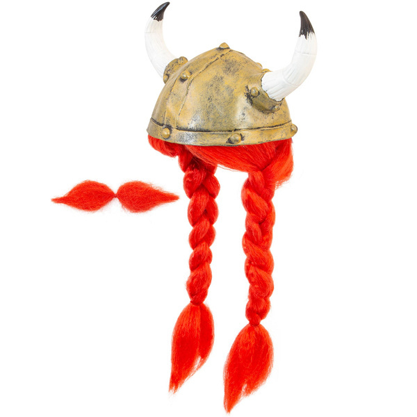 Peruka wykonana z rudych prostych włosów zaplecionych w dwa warkocze. Kask sylikonowy ze sterczącymi rogami. Włosy doczepione do kasku na stałe. Do zestawu dołączone są wąsy.