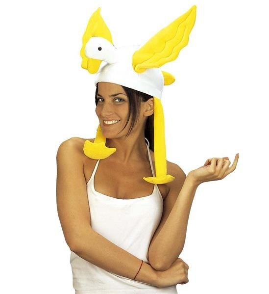 Do czapki przymocowany dziób, oczy oraz dwa żółte skrzydła.