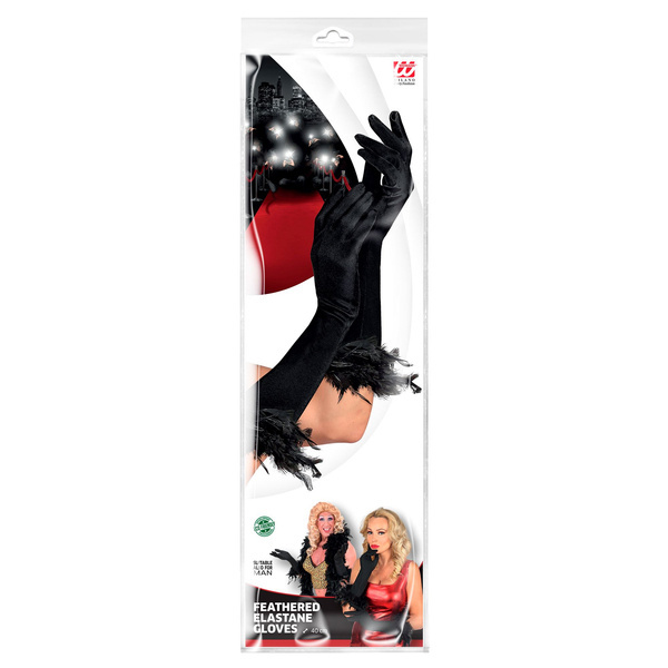 Wykończone czarnymi piórami.Rękawiczki elastyczne, z lycrą.