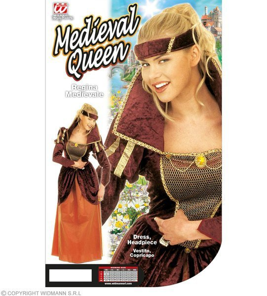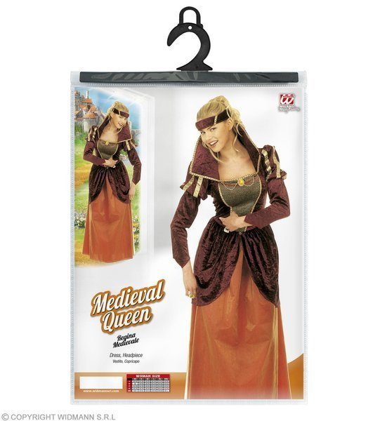 Suknia w kolorze pomarańczowo-brązowym, zdobiona złotymi dodatkami oraz brązową opaską.